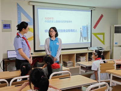 珍爱生命,远离毒品。倪警官邀请团队志愿者周琴向孩子们科普了中国历史上最著名的禁毒事件——虎门销烟,并播放有关禁毒知识的微视频,孩子们通过视频学习,了解到吸毒者面部、身体、行为的相关特征,认识到了吸毒的严重危害,提高了孩子们识毒、防毒、拒毒的意识。