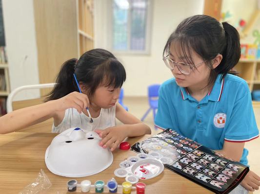 了解脸谱的历史和不同颜色脸谱背后代表的寓意后,志愿老师开始教孩子们自己绘制脸谱。工作人员为大家分发了面具脸谱、颜料、画笔等工具。准备工作完成后,志愿老师详细地给孩子们介绍了京剧脸谱绘制技艺、制作步骤等知识,讲解了不同脸谱的绘画方法,以及如何用画笔勾勒线条、晕染颜色。孩子们用鲜艳的色彩在空白的脸谱胚上绘制纷繁复杂的图案,或是细笔勾勒,或是豪放泼洒,画笔下生出奇思妙想,将京剧传统脸谱与自己的创意相结合。一张张极具孩子们个性特征的京剧脸谱在他们笔下呈现,一笔一画都精细流畅,每个神情姿态都不一样,绚丽多彩,令人赞叹。每个人都在骄傲地展示自己的作品。孩子们将脸谱面具用绳子穿好,戴在自己脸上,学着京剧里的段子有模有样地比划着,教室里一片欢声笑语。孩子们在课下的采访中表示非常喜欢这节课,有趣的脸谱绘制打破了他们对京剧晦涩难懂的传统印象,让他们对非遗文化产生了浓厚兴趣。