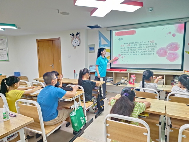 不闻不若闻之,闻之不若见之,见之不若知之,知之不若行之。只是简单地了解黄梅戏的相关知识是远远不够的,张晓洁老师还带领孩子们一起学唱戏曲——《天仙配》。台上的老师教得认真,唱得精彩,台下的学生学得认真,听得陶醉,悠扬的黄梅雅韵也不时赢得孩子们的热烈掌声和大声喝彩。戏曲为师生们打开了探索传统文化之美的大门,传播了国粹文化,增强了孩子们对传统文化的认同感与归属感。为了进一步激发孩子们的学习热情,张晓洁老师还采用了小组PK唱戏曲的模式,讲台上的孩子们扮演着一男一女的角色唱着戏曲,偶尔还会摆手势,增强表演效果,活动现场气氛热烈,孩子们热情高涨,增加了他们对戏曲的喜爱。