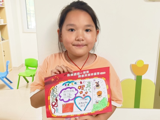 “家”的文化只有在分享与传承中才能历久弥新。志愿者不仅带领孩子们学习了各民族的文化,还鼓励孩子们分享自己民族的故事与习俗。孩子应当在生活的点滴小事中发现并了解自己独特的家乡文化,从汉字墨香温存的一笔一划中体悟时代传承中的表达。此次课程中张晓洁让孩子们围绕“民族团结一家亲,同心共筑中国梦”这一主题绘制手抄报,孩子们都深刻感悟了此次课程所学,手抄报或笔触细腻,或图文并茂。孩子们还积极分享了自己的手抄报作品,用朴素的语言表述了自己的创作思路,流露出对中华民族一家亲、共同铸就中国梦的真挚期愿。