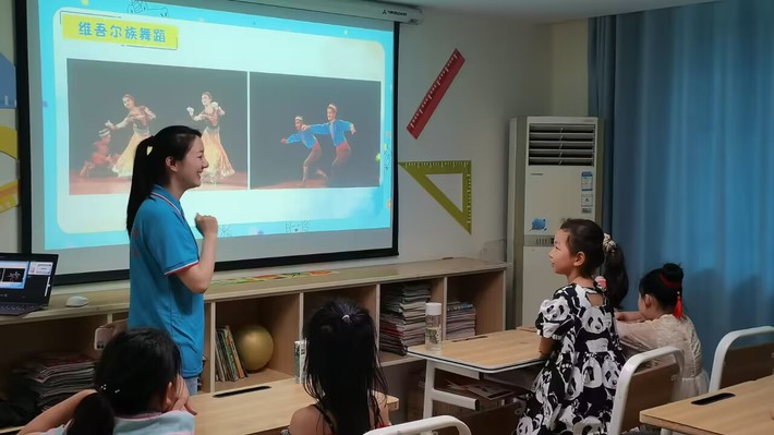 课程开始,老师在自我介绍后,亲切地询问同学们关于少数民族的知识,“你们知道我国有多少个民族吗?在座的各位有少数民族的同学吗?你们有去少数民族居住过的地方旅游吗?给你印象最深刻的是什么呢?”一个个问题不仅帮助老师进一步了解小朋友们的知识状态,也让他们对本次的课堂内容产生更浓厚的兴趣。在同学们的期待下,王老师身临其境地带领同学们前往中国各地“旅游”、“参观”少数民族的舞蹈,与同学讨论民族舞蹈的特色。