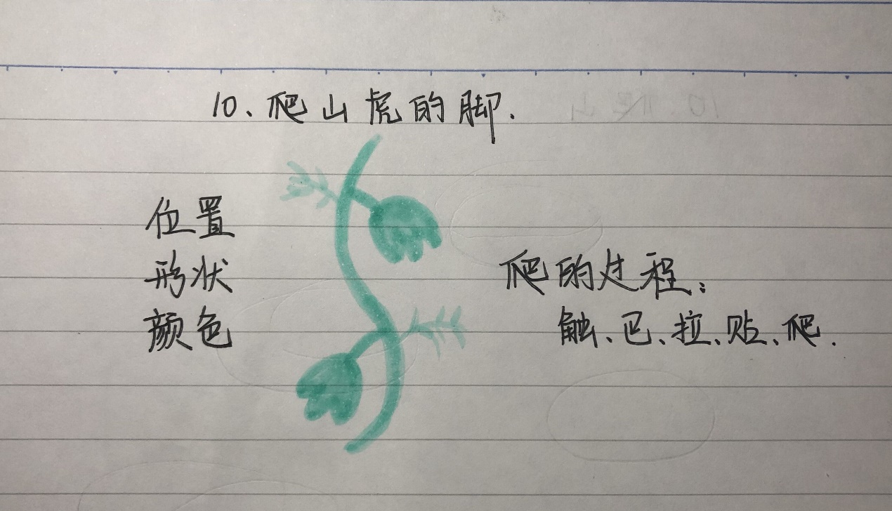 第二课时 (一)、复习导入,明确目标 1、听写词语:操场、嫩茎、舒服、均匀、重叠、空隙、叶柄、枯萎、牢固。 2、师:上节课,我们初步学习了《爬山虎的脚》,了解了课文大致的内容,书写了生字,并且了解了爬山虎生长的环境以及叶子的样子。爬山虎的叶子给你留下了怎样的印象呢?(生自由答) 3、师:文章题目是“爬山虎的脚”,作者先写了爬山虎的叶子。这是为什么呢?爬山虎的脚到底是什么样子的,又是怎样爬的?作者是怎么了解到这些的?这节课我们就来继续阅读文章,发现秘密。 【设计意图:在导入新课前进行词语听写,能够有效检测学生词语的掌握情况。回顾第一课时的学习内容和收获,顺势提出新的学习任务,建立起两课时学习内容和任务之间的联系,让学生怀着积极的学习期待心理。】 (二)、细读课文,聚焦观察 1、体会“脚”的特点。 (1)师:默读文章后三个自然段,想一想课文写了爬山虎“脚”的哪几个方面?从哪些地方可以看出作者观察特别仔细?请同学们在句子旁边做简单批注。 (2)师生互动交流:交流“脚的位置、形状、颜色”。 (3)深入感悟。 ①课件呈现“脚”位置的句子。 师:同学们,爬山虎的脚在哪里呢?(出示图片)这就是茎上长叶柄的地方。那它的脚长在哪里?哪位同学愿意上台画出脚的位置?(生上台) ②课件出示“脚”形状的句子。 师:那么,爬山虎脚的形状又是怎祥的呢?请同学们朗读这个句子。(生朗读) 师:作者把爬山虎脚的样子比作什么?(生答) 师:当它巴住墙的时候变成了什么样子呢?谁能联系下文说说。(指名回答) (师出示“蛟龙的爪子”和“爬山虎的脚”的对比图) 师:观察这两张图片,它们和爬山虎的脚相似吗?(生答) 师:叶圣陶爷爷为什么能写得这样具体形象呢?(生答:仔细观察)是啊,叶圣陶爷爷观察得多么仔细,描写得多么逼真! ③课件出示“脚”颜色的句子。 师:爬山虎的脚是什么颜色的?(生答)爬山虎的脚位置长得这么隐蔽,形状像蜗牛的触角那么细,都被叶圣陶爷爷发现了。大家猜猜,他是怎么发现的? (5)教师小结。 师:是啊!叶圣陶爷爷因为经过连续仔细的观察,才能抓住爬山虎脚的特点,才会写得这么细致。让我们再齐读这段文字,进一步感悟它的写法吧!(生朗读) 2、体会“爬”的过程。 (1)师:继续默读课文,思考爬山虎是怎样爬的?边读边把写爬山虎怎样爬的动词圈画出来。 (2)师生互动交流。 ①交流汇报。师:作者都用了哪些十分贴切的动词写出了爬山虎爬的过程呢?(课件出示:触、巴、拉、贴、爬。) ②再读交流。师:想想这几个动词的位置能调换吗?为什么?请再次默读课文思考。 ③总结提升。师:这些词是有先后顺序的,不能互换,它们之间也存在着因果关系,比如,正是细丝由直变弯曲,缩短了茎与墙的距离,产生了拉力,才使它在墙上贴得紧。叶圣陶爷爷准确运用了这些动词,才把爬山虎的脚是怎么爬的过程写得很具体,写得这么有序。我们应该学习这种准确表达的方法。 ④师:假如你就是那棵爬山虎,告诉大家你是这样爬的?(指名朗读课文)你们读着读着,老师仿佛看到了那棵爬山虎正一脚一脚地往上爬。 (3)加深理解。 师:这里的“一脚一脚地往上爬”能换成“一步一步地往上爬”吗?为什么? 师小结:原来爬山虎可不像动物那样几只脚交替着爬,而是长一只脚巴住墙,再爬就必须再长一只脚,再巴住墙。一直往上长,必须不断长出新脚。所以,叶圣陶爷爷才说爬山虎是“一脚一脚”往上爬。 (4)课件演示。 演示爬山虎爬的过程,一边演示,师生一边诵读课文内容。 3、比较“脚”的不同。 (1)发现变化。 师:叶圣陶爷爷还知道了爬山虎脚的秘密,你们知道是什么吗? (2)交流反馈。 ①发现脚之秘密。师:谁能来说说是什么秘密吗?(指名回答) ②感受脚之力量。师:“要是你的手指不费一点儿劲,休想拉下爬山虎的一根茎”这句话说明了什么呢?(指名回答) ③激发喜爱之情。师:可见爬山虎的脚巴住墙是多么牢固啊!风能掀下它,不让它继续往上爬吗?(不能!)雨能阻挡它,不让它向上攀登吗?(不能)可见爬山虎的脚具有多么不屈不挠的攀登精神啊!现在,你对爬山虎的脚产生了什么新的感受?(生自由回答) 4、小结方法 (1)师:叶圣陶爷爷为什么能向我们展示这么可爱的爬山虎?你从作者观察爬山虎中受到了哪些启发? 【设计意图:在学习描写爬山虎脚的重点部分,理解爬山虎是怎样一脚一脚往上爬有一定的难度。在教学时要采用多种方式引导学生读懂,并充分交流读书的收获。为了突破这一理解上的难点,借助多媒体展示爬山虎紧贴着墙往上爬的课件,一边演示一边读文,图文结合,引导学生自主发现爬山虎是怎样一脚一脚往上爬的。课文的最后一部分,通过运用对比的方法引导学生进行学习。】 (三)、教师总结,拓展延伸 1、师总结:同学们,世间万物丰富多彩、美不胜收,而且有着千丝万缕的联系。如果我们细心观察,就能发现许多大自然的奧秘。课后,请同学们仿照《爬山虎的脚》一文的观察方法,仔细观察一种植物。观察的时候,可先从远处整体看,再从近处一部分一部分仔细看, 特别要细心观察它的茎、叶、花,看看有什么特点,甚至有什么变化,做好观察记录,最后再具体写下来。 2、布置作业:课件呈现课后资料袋,自主选择一种记录方法进行记录。下节课交流讨论。 【设计意图:利用资料袋,观察自己感兴趣的植物,并做记录,使学生体会到观察是