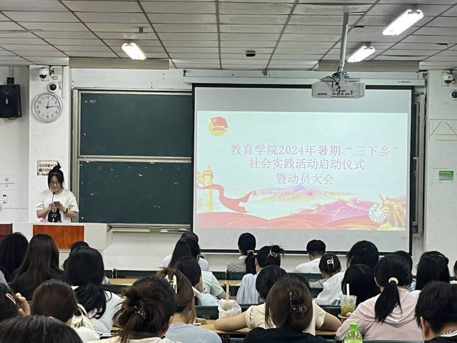风好正扬帆,实践须力行。为了响应国家乡村振兴战略,号召和动员学院广大师生积极参与社会实践自身力量服务社会实践,贡献青春力量6月19日中午12:10在三栋101教室举行教育学院2024年暑期“三下乡”社会实践活动启动仪式暨动员大会标志着这一充满青春活力和服务热情的社会实践活动正式拉开帷幕。出席这次大会的有教育学院党委副书记王迅、团委副书记张弦乐,团委学生兼职副书记屠厚辉、李艾锦以及三下乡重点团队和实践小组的成员。会议由组织部部长朱思宇主持。