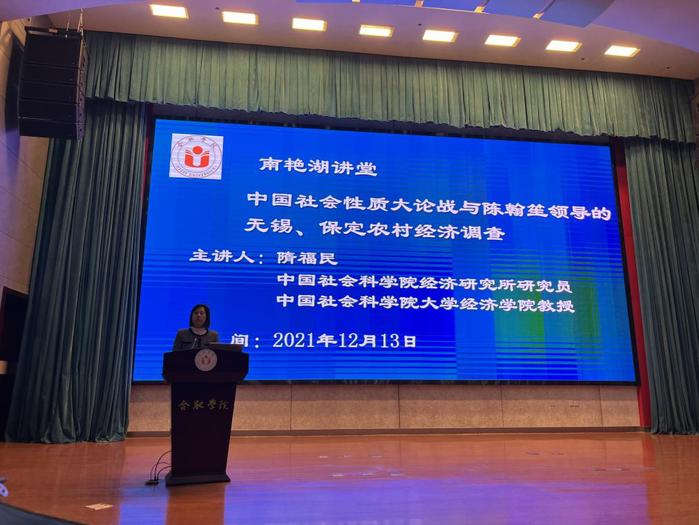12月13日下午,我校“南艳湖讲堂”第二讲在图书馆A报告厅举行,中国社会科学院经济研究所研究员、中国社会科学院大学经济学院教授、博士生导师隋福民作了题为《中国社会性质大论战与陈瀚笙领导的无锡、保定农村经济调查》的学术报告。校长吴春梅出席并主持报告会。经济与管理学院院长陈江华、部分师生以及相关单位教职工参加。