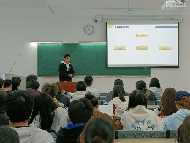 首先,成晓超向学生干部介绍学生社团的概念以及性质,增强了大家对学生社团的理解,加入社团既能丰富校园生活,也增进了学生德智体美劳发展,学生可以在此发挥自己的特长,锻炼工作能力。随后,他讲述了学生社团组织架构,以及各部门职责简介,帮助院学生会同学更好的理解自己负责的职务。他明确了社团组织建设、社团组织管理的内要,并介绍了学生社团负责人的选举条件,学生社团负责人必须政治立场鲜明,学习成绩优秀,组织能力突出且未受过学校处分。最后,成晓超对学生社团的宣传和活动安排提出要求,学生社团应坚持正确的舆论导向,确保发布内容积极健康,举办活动要经过多方审批等。