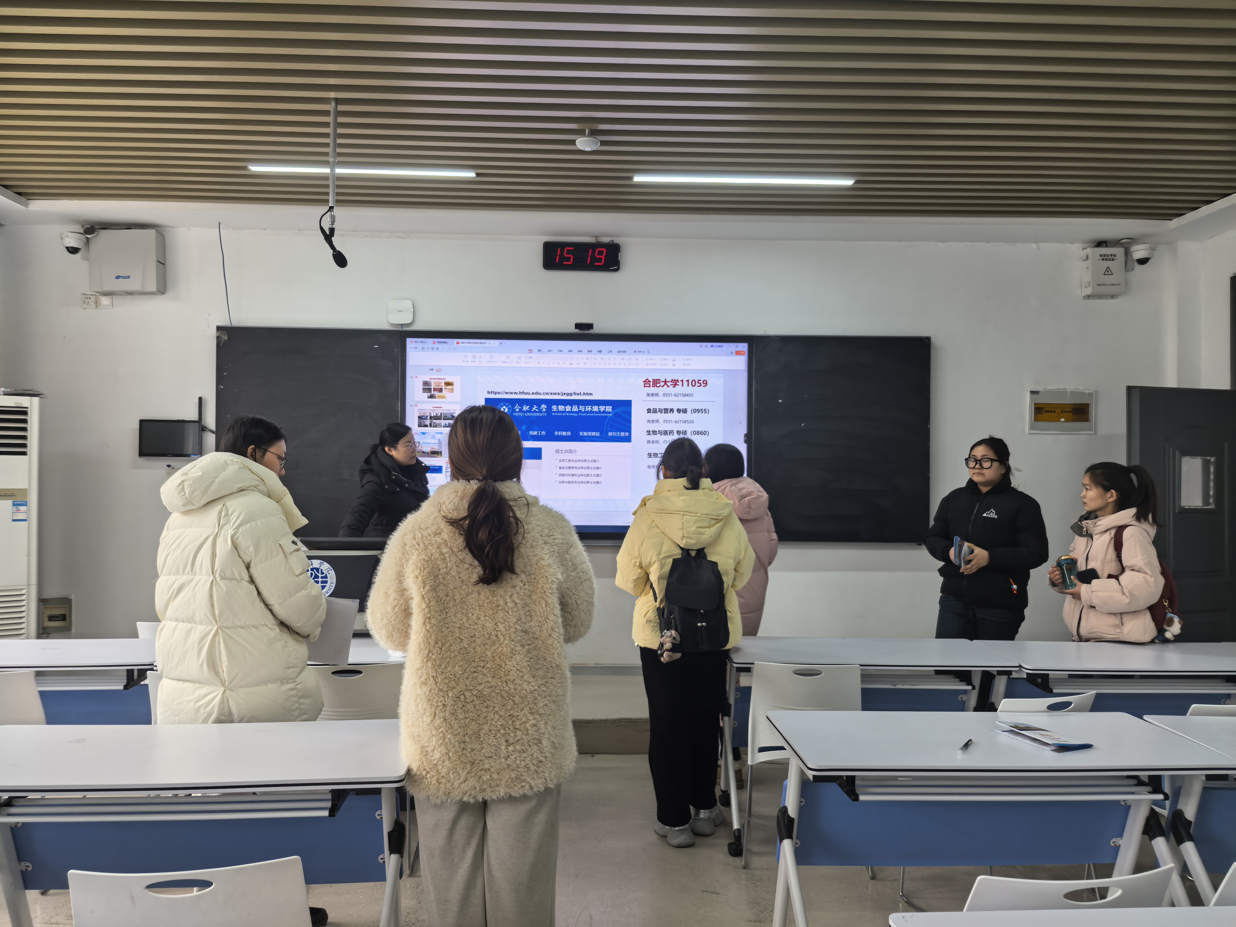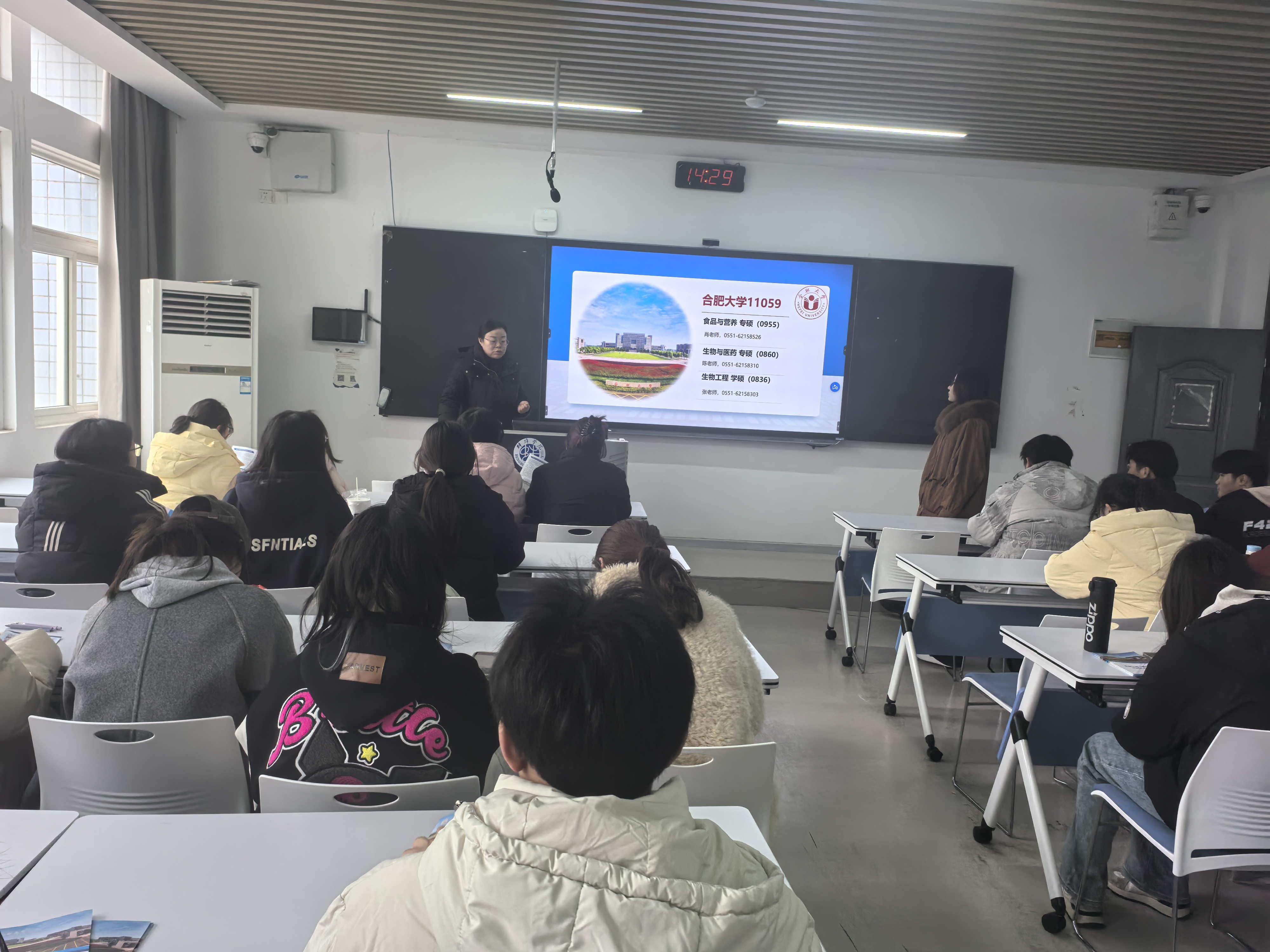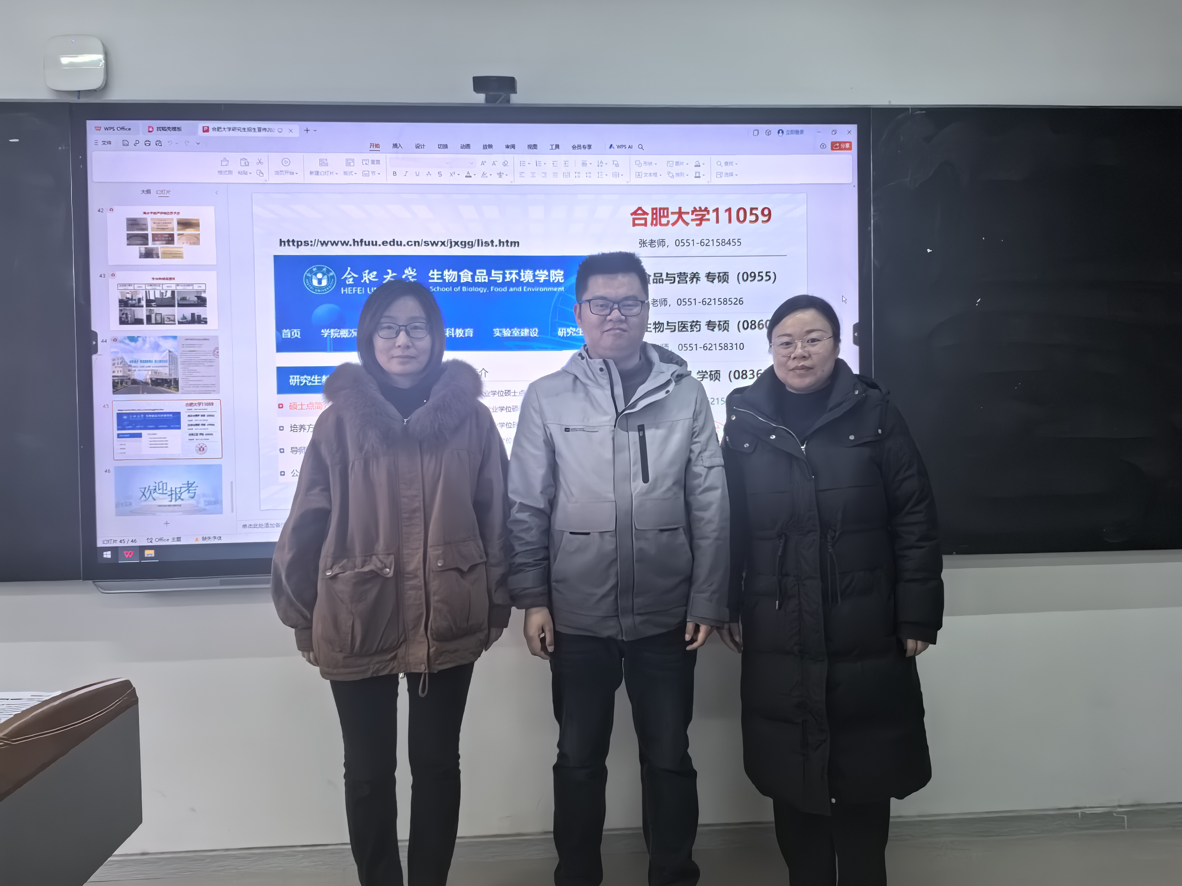 在蚌埠学院,食品与生物化工学院杨俊老师、土木与水利学院副院长朱兰保和水利工程系党支部书记潘争伟接待并精心安排了宣讲场所与参会学生,宣讲对象主要为相关专业的大三和大四学生。在宣讲过程中,环境与资源硕士点负责人刘晓薇从专业特色、科研项目及国际合作等方面进行了介绍,强调该专业在环境污染治理、资源循环利用及生态修复等前沿领域的研究优势。食品营养与健康硕士点负责人肖青青详细介绍了该专业的培养目标、课程设置、研究方向、招生计划、科研项目成果及就业前景,并指出该专业紧密结合国家“健康中国”战略需求,致力于培养复合型人才。此外,宣讲团队还详细解读了生物与医药和生物工程两个专业的招生计划、研究方向及培养模式,强调产学研结合和创新能力培养。