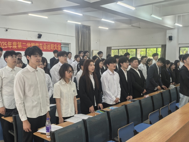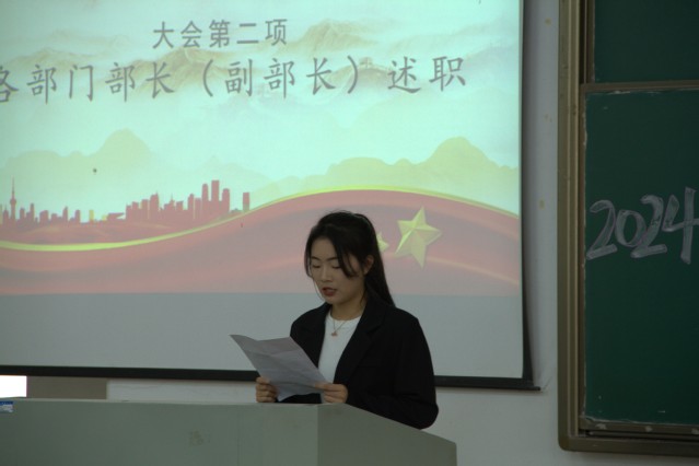 大会伊始,由主持人旷家昱上前致辞,宣布大会开始。大会第一项,全体起立,奏唱共青团团歌,在一声声庄严的团歌渲染下,全体成员不禁面容庄重,共唱共青团团歌。大会第二项,由各部门部述职,各部长讲述了各自部门的工作成果、不足之处、未来规划以及感谢寄言。大会第三项,由主席团代表成晓超进行全面述职。在过去的一年里,学生会秉持“全心全意为同学服务”的宗旨,扎实推进各项工作,丰富同学们课余生活,展现了生会积极进取、追求卓越的决心。大会第四项,院团委负责人杨林对学生会的工作做出指导,希望各部门充分发挥学生组织的示范引领作用,为学校发展和同学成长贡献更多青春力量。大会最后一项,李秀娟做总结讲话对学生会成员的辛勤付出给予高度赞扬,强调学生会要始终坚持正确的政治方向并结合自身经验希望学生会以此次述职大会为契机,总结经验、正视不足,加强自身建设。