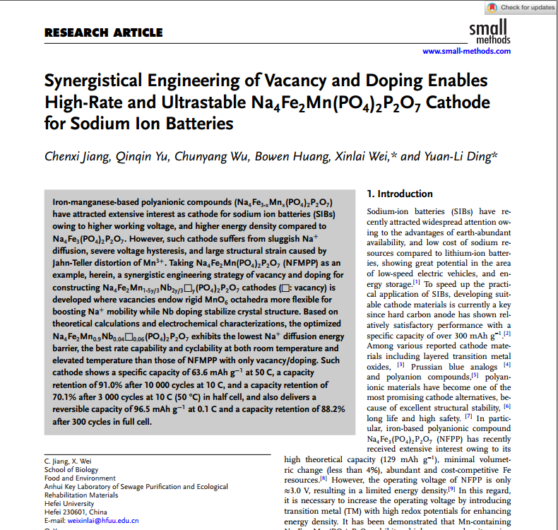 20255月,日韩欧美福利视频_黑人巨大人精品欧美三区_欧美成人另类人妖_欧美在线精品一区二区三区_欧美一区二区三区性视频_日韩精品欧美视频_性欧美极品xxxx欧美一区二区生物食品与环境学院22级资源与环境专业研究生蒋晨熙以第一作者身份在国际学术期刊《SmallMethods》(IF=10.7,中科院二区)发表了题为“SynergisticalEngineering of Vacancy and Doping Enables High-Rate and UltrastableNa4Fe2Mn(PO4)2P2O7Cathode for Sodium IonBatteries”的研究论文。我校高级实验师卫新来、湖南大学教授丁元力为通讯作者,日韩欧美福利视频_黑人巨大人精品欧美三区_欧美成人另类人妖_欧美在线精品一区二区三区_欧美一区二区三区性视频_日韩精品欧美视频_性欧美极品xxxx欧美一区二区为第一完成单位。