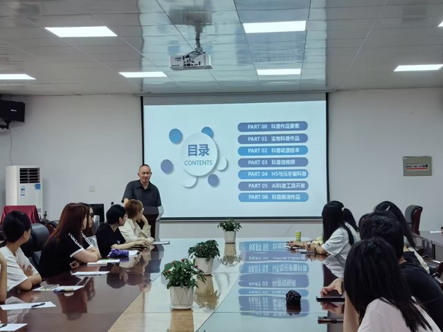 培训会上,张燕翔老师围绕“新时代科普作品的创新表达”主题,从科普作品的核心要素切入,系统讲解了实物科普作品、科普动漫绘本、微视频、H5与元宇宙科普、科普工具开发及展演作品等多元创作形式。他结合往届国家级、省级优秀获奖案例,通过现场播放视频、展示图文资料等方式,生动剖析了优秀科普作品的创意设计思路与技术实现路径。在互动环节,张老师针对同学们提出的“ai是否原创”“网络资料版权问题”等问题进行了细致解答,并鼓励大家立足学科特色,用创新思维传播科学知识。