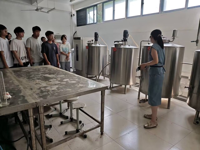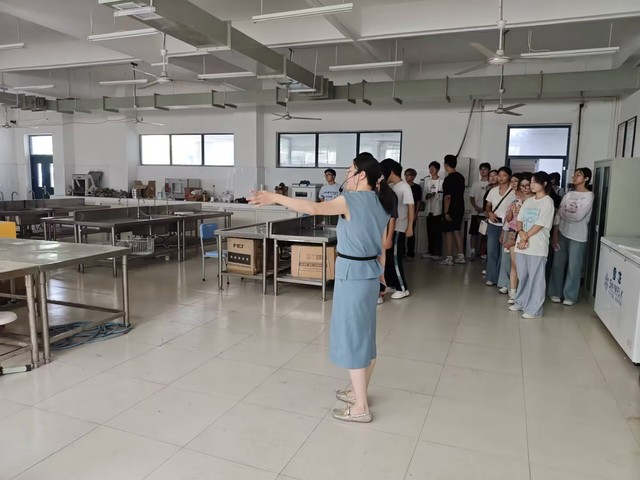 活动伊始,由领队老师在生化楼前为新生作动员讲话,围绕实验室安全规范、生物学科研究方向及实验教学体系展开介绍,强调安全是科研底线,为新生明确了参观纪律。随后,新生以班级为单位,有序参观发酵工程实验室、微生物检测实验室等核心实验室。在发酵工程实验室,指导教师介绍了各类发酵罐体功能,说明其在酸奶、生物肥料等产品生产中的应用。参观过程中,新生们认真聆听讲解,不时就实验设备用途、科研项目等问题提问,师生互动氛围热烈。同时,教师提醒新生,未来课程涉及实验操作时,可提前向学长学姐请教,获取操作指导。