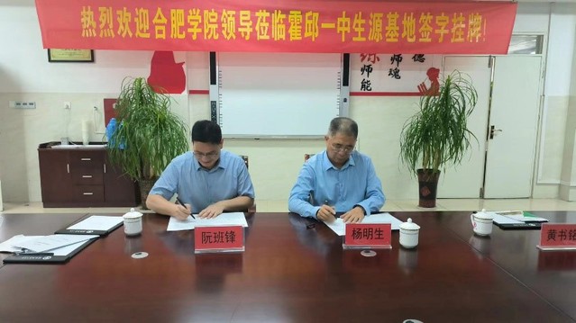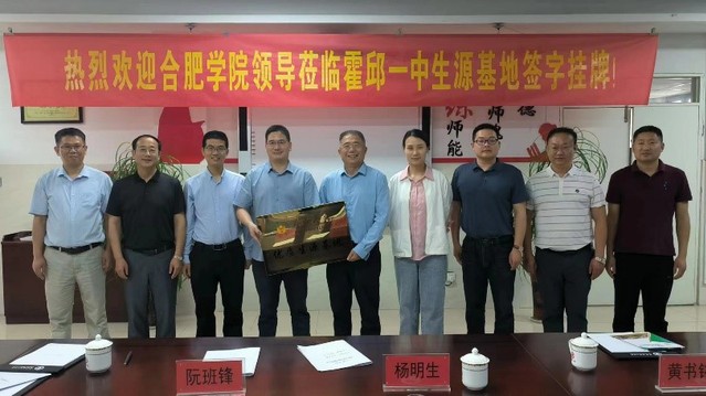 座谈会后,双方举行了合肥学院和毛坦厂中学东城校区“优质生源基地”授牌仪式。在霍邱县第一中学,党委书记、校长杨明生,副校长王德宝、许正田等校领导首先带领宣传小组参观了霍邱一中校园及周边环境。随后,在霍邱一中名师工作室双方签订了战略合作协议,举行了合肥学院“优质生源基地”授牌仪式。在仪式上,杨明生校长介绍了霍邱一中近年来的办学情况、校园文化建设和教育教学改革情况;阮班锋院长介绍了合肥学院的办校历史和办学特色,陈俊院长介绍了生物食品与环境学院的专业设置和学科特点等情况,希望未来有更多的霍邱一中优秀学子进入合肥学院深造。双方都表达了加强沟通交流与友好合作的意愿。