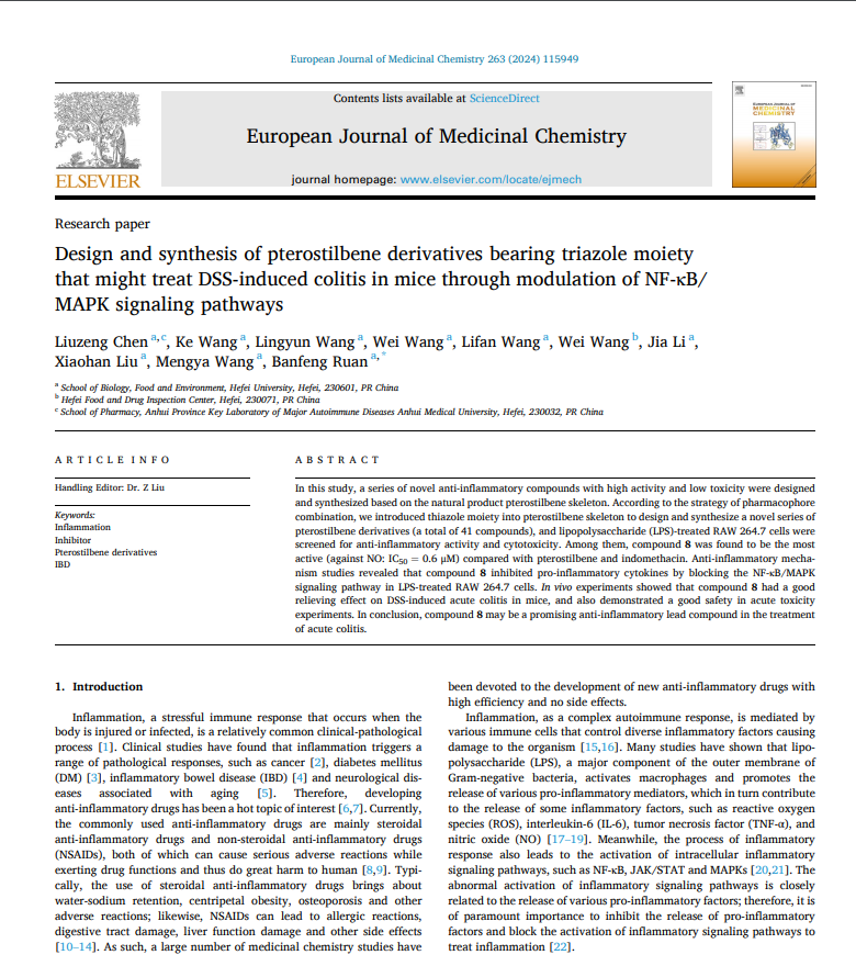 近日,合肥学院生物食品与环境学院阮班锋研究员团队在药物化学国际知名期刊European Journal of Medicinal Chemistry(中科院一区top)上发表了题为“Design and synthesis of pterostilbene derivatives bearing triazole moiety that might treat DSS-induced colitis in mice through modulation of NF-κB/MAPK signaling pathways”的研究论文。本研究基于药食同源化合物紫檀芪为母核骨架设计了一系列具有高活性和低毒性的新型抗炎化合物。依据分子杂交策略将三氮唑部分引入到紫檀芪骨架中,经过两轮的构效关系分析合成了一系列新的紫檀芪衍生物。其中,化合物8具有突出的体内外抗炎活性。实验表明,化合物8对DSS诱导的小鼠急性结肠炎具有较好的缓解与治疗作用,并且在急毒方面也表现出良好的安全性,表明化合物8在急性结肠炎药物开发方面可能是一个有前景的先导化合物。