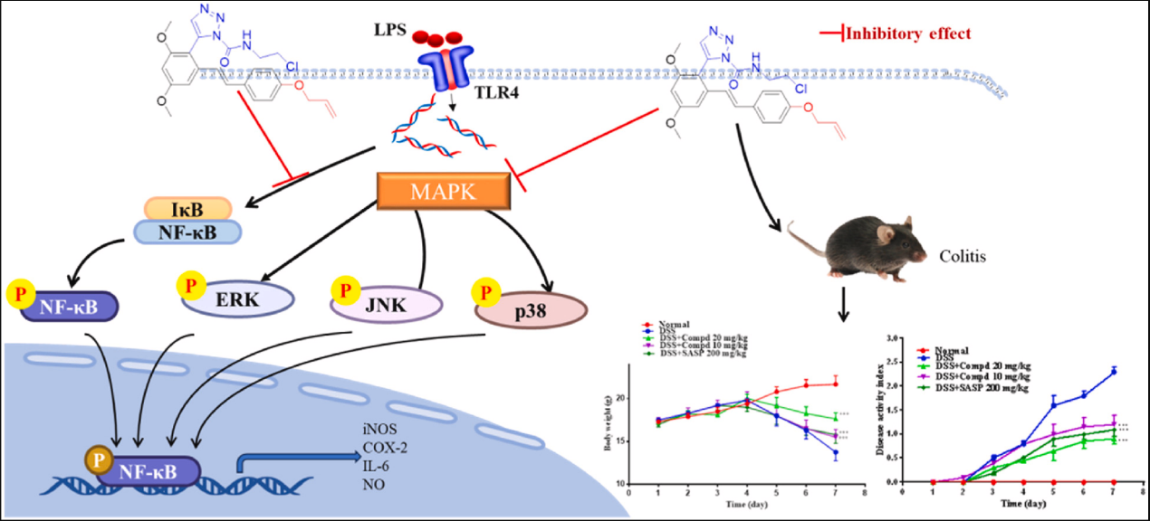 合肥学院阮班锋团队:Design and synthesis of pterostilbene derivatives bearing triazole moiety that might treat DSS-induced colitis in mice through modulation of NF-κB/MAPK signaling pathways