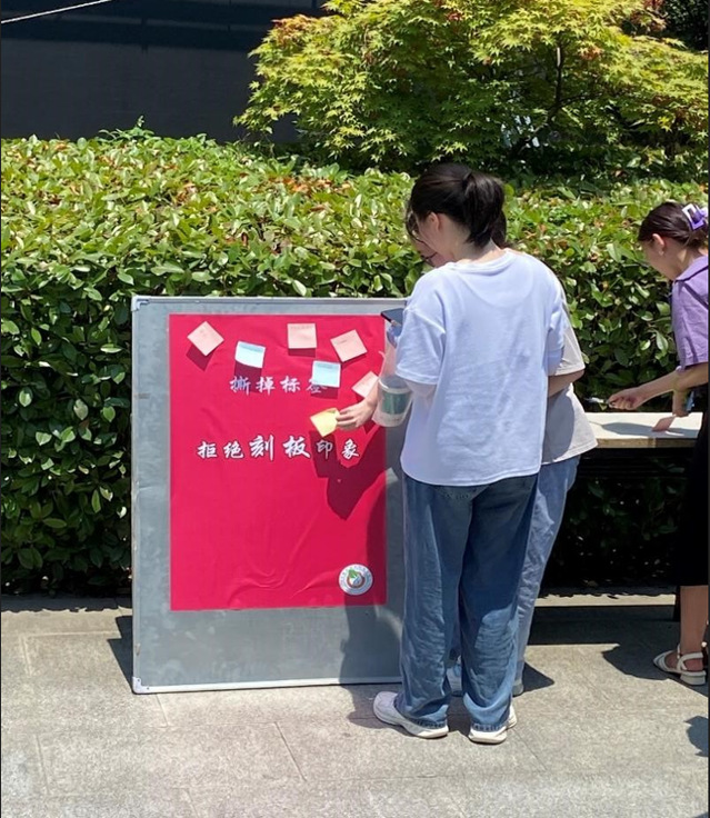 活动期间,同学们了解了标签对个人心理健康的负面影响。拒绝不合理的标签,在放置的板子上,将生活中常见“标签”的便利贴贴上,同学们写下了各种对自己心理造成压力的话,然后通过交流和了解,逐步撕掉这些标签。