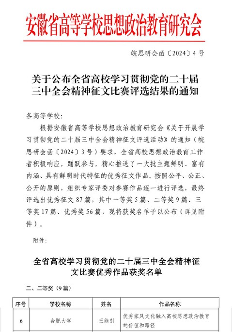 20241119日,根据安徽省高等学校思想政治教育研究会《关于公布全省高校学习贯彻党的二十届三中全会精神征文比赛评选结果的通知》(皖思研会函〔20244 号),我院王能引老师撰写的论文《优秀家风文化融入高校思想政治教育的价值和路径》荣获二等奖。
