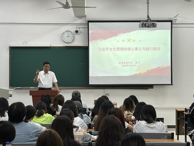 周飞从什么是文化开讲,介绍了文化的概念多样性以及文化分类,进而阐释了文化的价值以及与文明的关系,重点讲了习近平文化思想的生成逻辑、科学内涵以及践行路径。周飞指出,习近平文化思想是新时代党领导文化建设实践经验的理论总结,是坚持“两个结合”、推进马克思主义文化理论创新发展的重大成果,标志着党对社会主义文化建设规律的认识达到新高度。其生成逻辑源于对马克思主义文化理论的继承与发展,立足于中华优秀传统文化的深厚土壤,紧扣新时代中国特色社会主义建设的伟大实践,回应了时代发展的需求和人民的精神文化期待。周飞还通过列举习近平总书记考察历史文化场馆、强调文化传承发展的重要讲话等实例,生动展现了习近平文化思想在实践中的孕育与升华,结合学校文化建设实际与学生生活,提出要深学细悟习近平文化思想,将其融入校园文化建设、课堂教学以及社会实践中,鼓励同学们坚定文化自信,积极参与文化传承与创新活动,从中华优秀传统文化、革命文化和社会主义先进文化中汲取养分,在日常学习生活中弘扬社会主义核心价值观,以实际行动传播中国文化,讲好中国故事。 同学们纷纷表示,周书记的讲解让我们对习近平文化思想有了更系统、更深入地理解,也让我们认识到作为新时代大学生,在文化传承与创新中肩负的责任,今后会更加积极地参与到相关活动中。(图/文:李影) |
