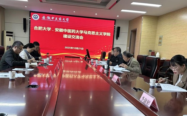 为进一步推进马克思主义理论学科建设和硕士点申报工作,学习借鉴兄弟院校在思政课改革、师资培育及科研平台建设方面的先进经验,10月21日,我院党委书记鲁先瑾、院长苏冰带领调研小组一行,赴安徽中医药大学马克思主义学院开展调研交流。 安徽中医药大学党委常委、宣传部部长,马克思主义学院院长董玉节,执行院长郭跃对调研组一行表示热烈欢迎。董玉节院长以“学科建设与学位点发展同频共振”为核心,从马克思主义理论学科的特色方向布局、硕士点内涵建设路径、思政课改革方案及工作举措,详细介绍了学院的办学特色与发展成果。