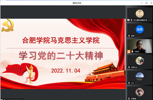 学深悟透党的二十大精神 ——马克思主义学院学习党的二十大精神(二) 11月4日下午,马克思主义学院再次开展学习贯彻党的二十大精神线上学习会。马院全体专兼职思政课教师参加学习。 会上,马院副院长马保卫带领全体专兼职教师认真学习了党的二十大报告。马院长指出,二十大报告深刻阐释了新时代坚持和发展中国特色社会主义的一系列重大理论和实践问题,描绘了全面建设社会主义现代化国家、全面推进中华民族伟大复兴的宏伟蓝图,为新时代新征程党和国家事业发展、实现第二个百年奋斗目标指明了前进方向、确立了行动指南,是党和人民智慧的结晶,是党团结带领全国各族人民夺取中国特色社会主义新胜利的政治宣言和行动纲领,是马克思主义的纲领性文献。学习宣传贯彻党的二十大精神是当前和今后一个时期的首要政治任务,马院全体教师要围绕“九个深刻领会”,全面准确学习二十大精神,深入理解内涵,精准把握外延。要原原本本、逐字逐句学习党的二十大报告和党章,学习习近平总书记在党的二十届一中全会上的重要讲话精神,切实把思想和行动统一到党的二十大精神上来。