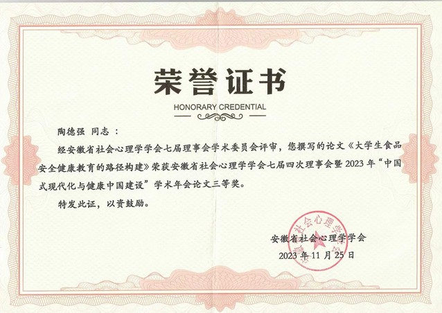 我院教师在安徽省社会心理学会2023年学术年会上获奖 11月25日,安徽省社会心理学会七届四次理事会暨2023年学术年会在铜陵召开。我院教师陶德强博士受邀参会,所提交论文荣获年会论文三等奖。