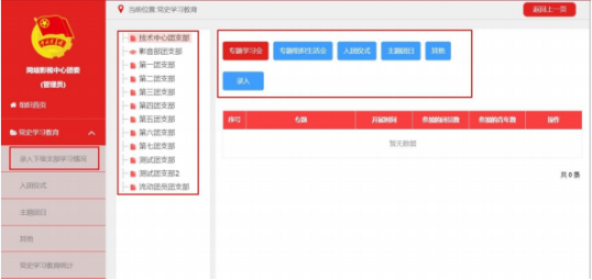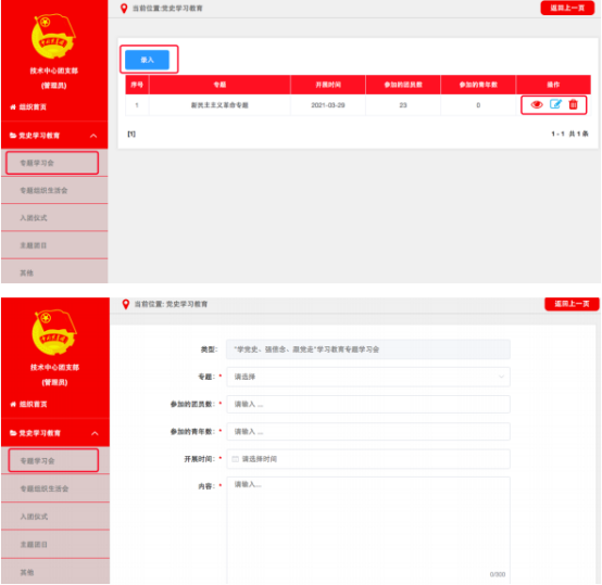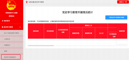 5、学习情况统计。各级管理员可实时掌握所属团组织党史学习教育专题学习会和专题组织生活会开展情况。其他录入数据由系统后台统计,不在该功能界面展示。