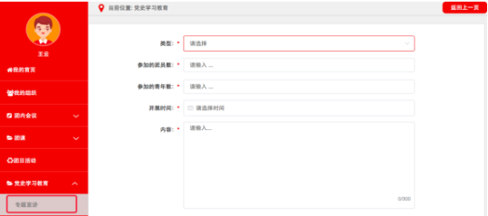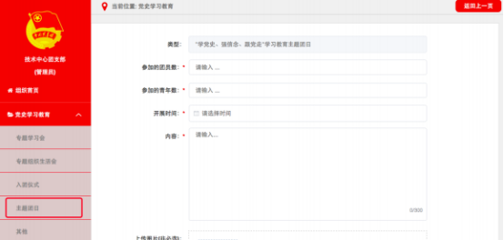 点击默认界面左上角“录入”按钮,进入“录入”界面。根据专题学习会内容,在“专题”下拉菜单中选择“新民主主义革命专题”、“社会主义革命和建设专题”、“改革开放专题”、“中国特色社会主义新时代专题”相应专题,并依次录入专题学习会“参加的团员数”、“参加的青年数”,选择“开展时间”,在“内容”栏填写简要情况。可结合实际上传图片资料(非必须,下同),点击“确定”即完成记载。