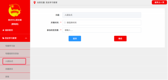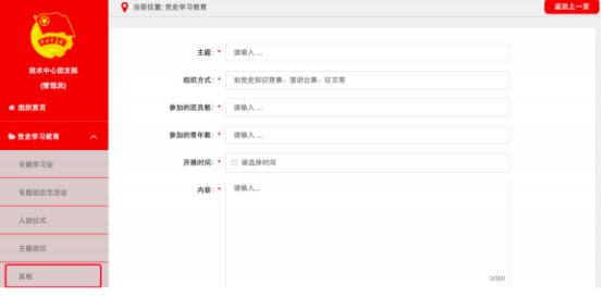 点击默认界面左上角“录入”按钮,进入“录入”界面。依次录入“主题”、“组织方式”、“参加的团员数”、“参加的青年数”,选择“开展时间”,在“内容”栏填写简要情况。可结合实际上传图片资料,点击“确定”即完成记载。