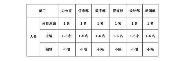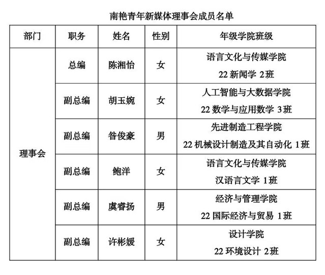 南艳青年新媒体中心设理事会,理事会下设办公室、信息部、数字部、新闻部、视、设计部六个部门。理事会设总编、副总编,各部门设分管总编、主编、编辑、实习小编。