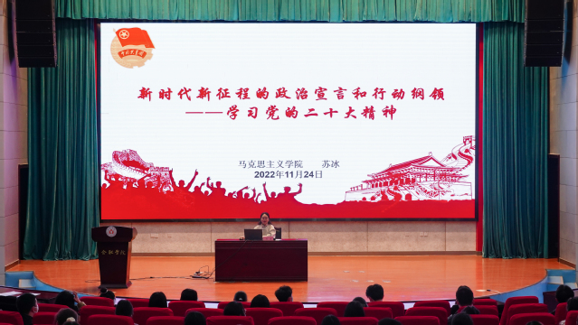 开班仪式后,马克思主义学院副院长、马克思主义学院直属党支部书记苏冰为学员授课,题目为《新时代新征程的政治宣言和行动纲领——学习党的二十大精神》。
