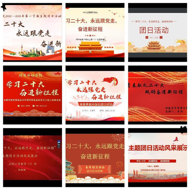为深入学习宣传贯彻党的二十大精神,团结引领我校青年将大会精神落实到行动上,用党的科学理论武装青年,用党的初心使命感召青年,鼓励青年在学习中坚定理想信念,在实践中练就过硬本领。10-11月,我校300多个基层班级团支部和34个社团团支部开展了以“学习二十大,永远跟党走,奋进新征程”为主题的线上团日活动。