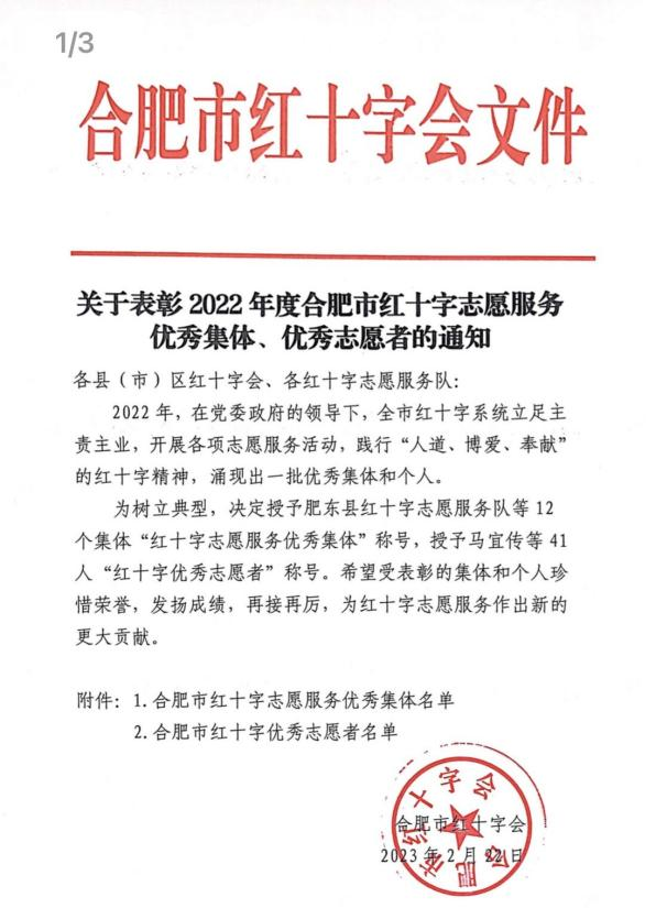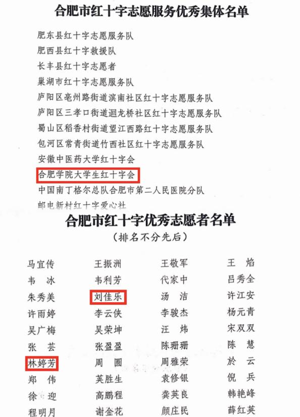 为树立典型,进一步践行“人道、博爱、奉献”的红十字精神,合肥市红十字会通报表彰了2022年度合肥市红十字志愿服务优秀集体优秀志愿者,我校大学生红十字会荣获“合肥市红十字志愿服务优秀集体”称号我校林婷芳和刘佳乐两位同学荣获“合肥市红十字优秀志愿者”称号。