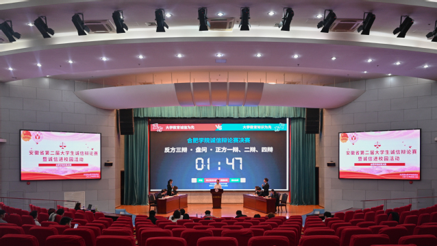 近日,省发展改革委、省教育厅举办安徽省第二届大学生诚信辩论赛暨诚信进校园活动。4月8日下午,合肥学院校辩论赛决赛在图书馆A厅顺利举行,邀请2020年第三届世界中医药学会联合会中医药主题辩论赛总决赛季军管祝、2021年第十一届安徽辩论联赛个人赛亚军杨耀文、第一届安锦赛亚军2021年华语辩论世界杯合肥赛区冠军邢松贺三位担任评委。
