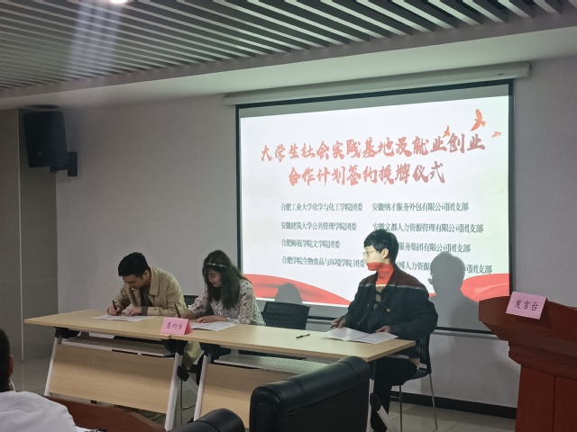 会上,生物食品与环境学院团委负责人杨林代表学院与锦绣社区团委、人力资源服务产业园团工委签订三方协议,进行“合肥学院大学生社会实践基地”挂牌。