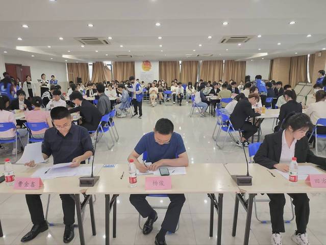 大赛分为两个环节,一是无领导小组讨论,二是模拟面试。选手通过抽签分为4组,根据指定命题进行了30分钟的小组讨论。在此期间,各小组激烈讨论,踊跃发言,进行了精彩的“头脑风暴”,上演了一场激烈的“唇枪舌剑”,充分展现了选手们在组织协调、表达及逻辑思维等方面的能力。评委们在旁听过程中给予选手针对性的指导,发散选手的思维,推进了比赛进程。讨论结束后,组内推选出一名选手作小组总结发言,并通过匿名打分每组推选出3位得分最高的选手进入了下一轮模拟面试。