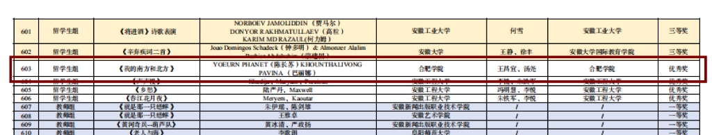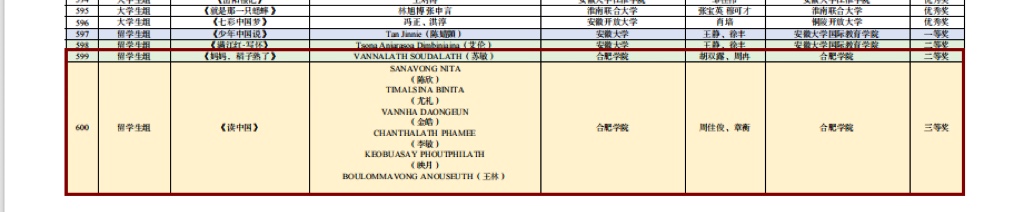 在“诵读中国”经典诵读大赛中,我校参赛选手以真挚的情感诵读经典诗文作品。其中,薛五恒、周雨欣、郭焓桢、邬逸凡《我爱你,中国》和高欣欣、肖博文、周思慧《以你为镜》获大学生组二等奖,薛五恒《中华颂》获大学生组三等奖,VANNALATH SOUDALATH(苏敏)《妈妈 ,稻子熟了》获留学生组二等奖,SANAVONG NITA(陈欣)、TIMALSINA BINITA(尤礼)、VANNHA DAONGEUN(金皓)、CHANTHALATH PHAMEE(李敏)、KEOBUASAY PHOUTPHILATH(映月)、BOULOMMAVONG ANOUSEUTH(王林)《读中国》获留学生组三等奖,YOEURN PHANET(陈长苏)、 KHOUNTHALIVONG PAVINA (巴丽娜)《我的南方和北方 》获留学生组优秀奖。