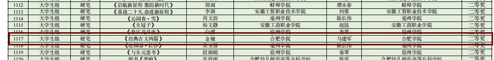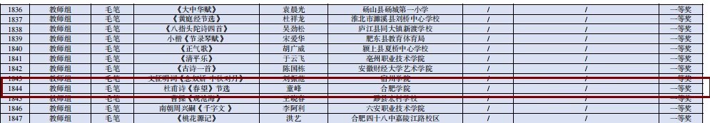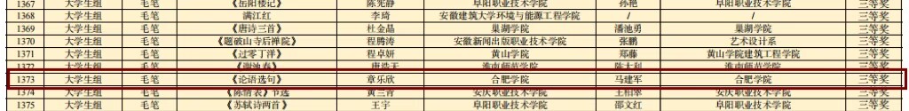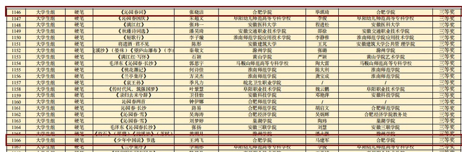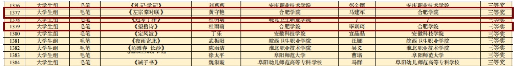 在“笔墨中国”汉字书写大赛中,金敏《经典古文两篇》获大学生组硬笔二等奖,张晓洁《沁园春词》和王鸿飞《少年中国说》节选获得大学生组硬笔三等奖,章乐欣《论语选句》、黄守艳《左宗棠对联》和杜雨萌《望岳诗》获大学生组毛笔三等奖,童峰杜甫诗《春望》节选获教师组毛笔一等奖。