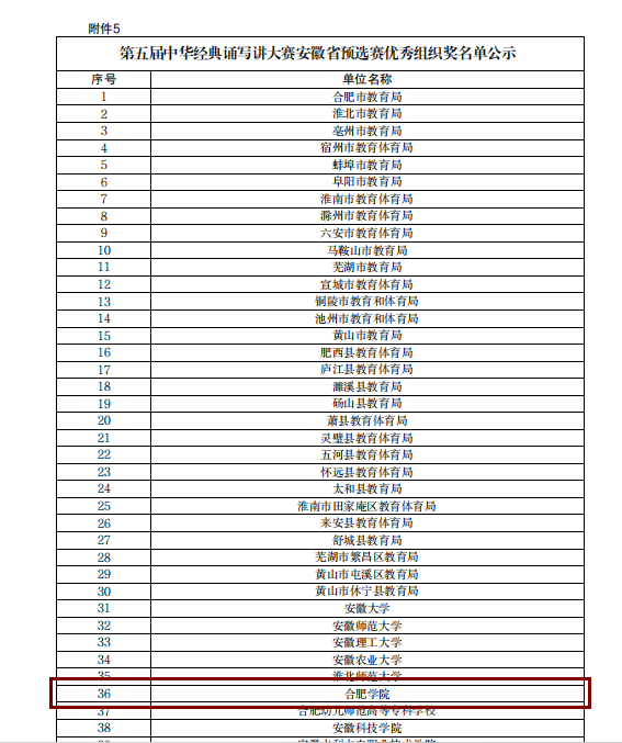雅言传承文明,经典浸润人生。为深入学习宣传贯彻全国语言文字会议精神,全面深入实施中华经典诵读工程,教育部、国家语言文字工作委员会组织开展了第五届中华经典诵写讲大赛。近日,安徽省预选赛获奖作品公示,我校师生积极参赛,多项作品获奖。其中,合肥学院荣获优秀组织奖。