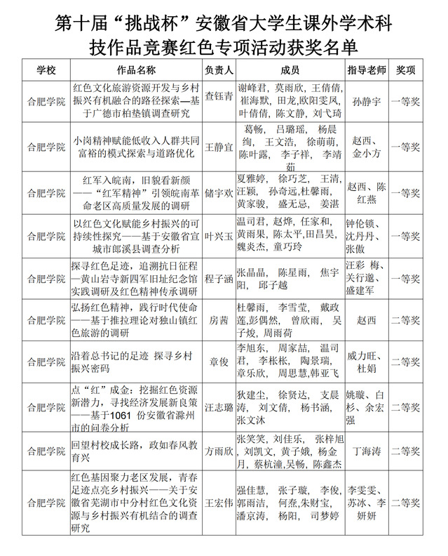 近日,由共青团安徽省委员会、安徽省教育厅、安徽省科学技术协会、安徽省社会科学院、安徽省学生联合会等单位共同主办的第十届“挑战杯”安徽省大学生课外学术科技作品竞赛红色专项活动结果揭晓。我校学生作品荣获省赛一等奖5项,二等奖5项。