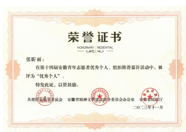 张昕雨,经济与管理学院20级经济学专业学生,中共党员,品学兼优,热衷参加和组织志愿服务活动,曾任校团委学生兼职副书记、校青志联主席团成员学习成绩优秀,获国家励志奖学金、一等奖学金。积极参加各类学科和技能竞赛,曾获第八届中国国际“互联网+”大学生创新创业大赛安徽省金奖、国家级铜奖等。多次获评校级三好学生、优秀学生干部、优秀共青团员、优秀志愿者、三下乡先进个人等荣誉称号。积极参加共建文明校园、暑期三下乡、安徽省脱贫攻坚第三方评估等志愿服务活动,担任2022年国家网络安全宣传周、2022年世界集成电路大会、2023年中国航天日等大型赛会服务的组织负责人,累计志愿时长达500小时。