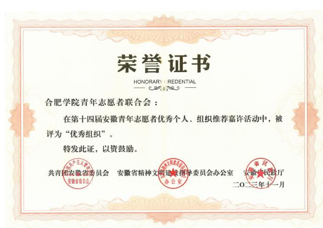 近日,由团省委、省文明办、省民政厅联合开展的第十四届安徽省青年志愿者优秀个人、组织嘉许名单公布,我校青年志愿者联合会获评“安徽省青年志愿优秀组织”,经济与管理学院张昕雨同学获评“安徽省青年志愿者优秀个人”。安徽省青年志愿者优秀个人、组织嘉许活动两年举办一次,本次活动共评选出31名高校志愿者优秀个人,10个高校志愿者优秀组织。