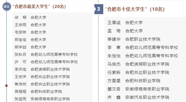 近日,由合肥市教育局、共青团合肥市委员会、合肥市学生联合会共同举办的寻访2023年度“合肥市最美学生”暨第十一届“合肥市十佳学生”评选活动结果公布。我校王厚诚、孟琦2位同学获评“合肥市十佳大学生”称号,徐桐、王宗雨、毛安琳、郑宝佳、胡宇喆5位同学获评“合肥市最美大学生”称号。