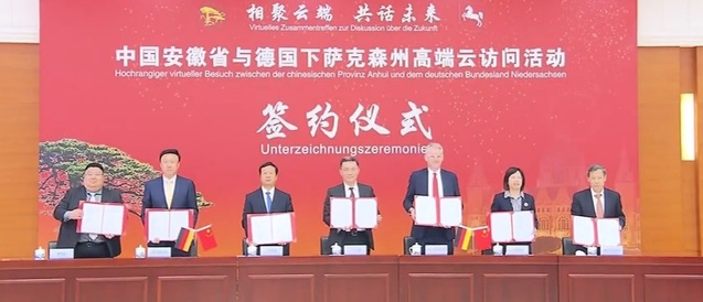 王清宪与魏尔线上签署了《中华人民共和国安徽省人民政府与德意志联邦共和国下萨克森州政府关于进一步深化友好省州关系合作意向书》并互赠礼品。