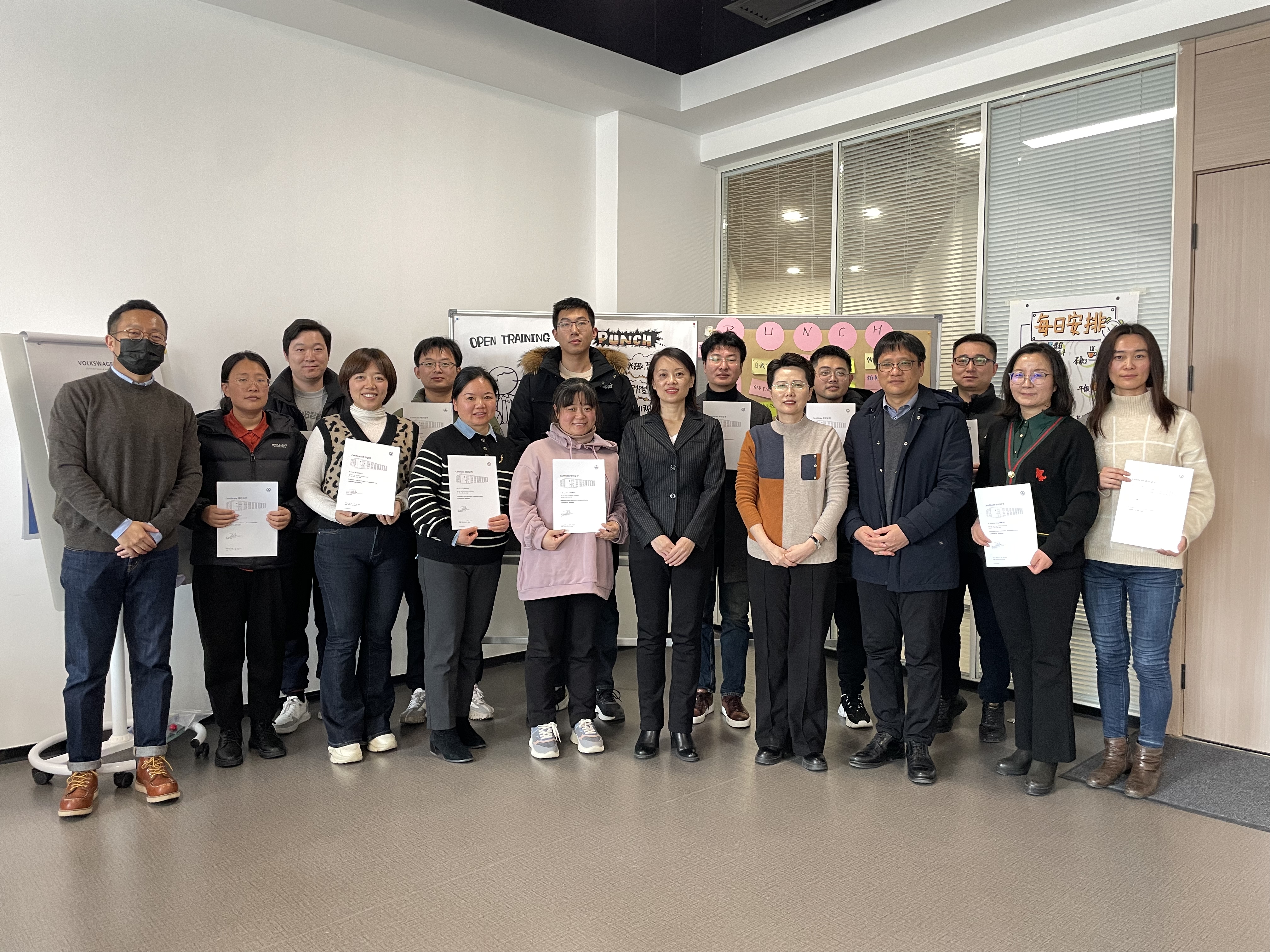 本次培训邀请了来自大众中国的资深培训师赵圣纳,针对培训中的沟通及演讲技巧进行了为期三天的培训。培训期间,教师们积极参与互动,学习了punch开场、故事性讲授、提问式互动、提前准备应对课堂挑战以及授课收尾的内容,并在最后一天将所学内容运用到实践中,最终圆满完成了培训任务并取得了结业证书。他们表示,通过本次培训学习了企业培训的技巧与方法,增强了对教学工作、产学研合作的信心和热情。