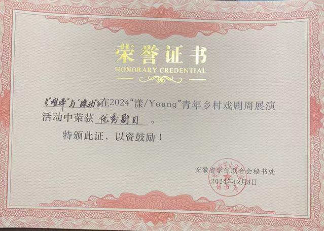11月30日,我院22、23级汉语言文学专业学生受邀前往长丰县马郢村参加2024/Young青年乡村戏剧节展演活动。此次戏剧节入选作品共有十三个,来自省内外多所高校及戏剧社团。我院参演剧目为《“喧哗”与“躁动”》,由语言文化与传媒学院第二届、第三届“雏荷杯”话剧节“雏荷奖”获奖剧组携手创作,此次演出获得观众好评,并荣获“优秀剧目”奖。