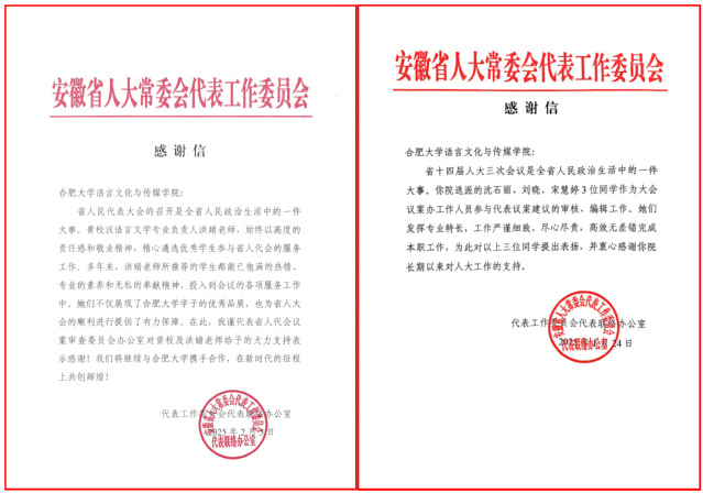 2025年1月19日至24日,我院中文系汉语言文学专业沈石丽、刘晓、宋慧婷三位同学圆满完成安徽省第十四届人民代表大会第三次会议的实习任务,受到省人大常委会代表工作委员会的高度肯定,并向我发来感谢信。