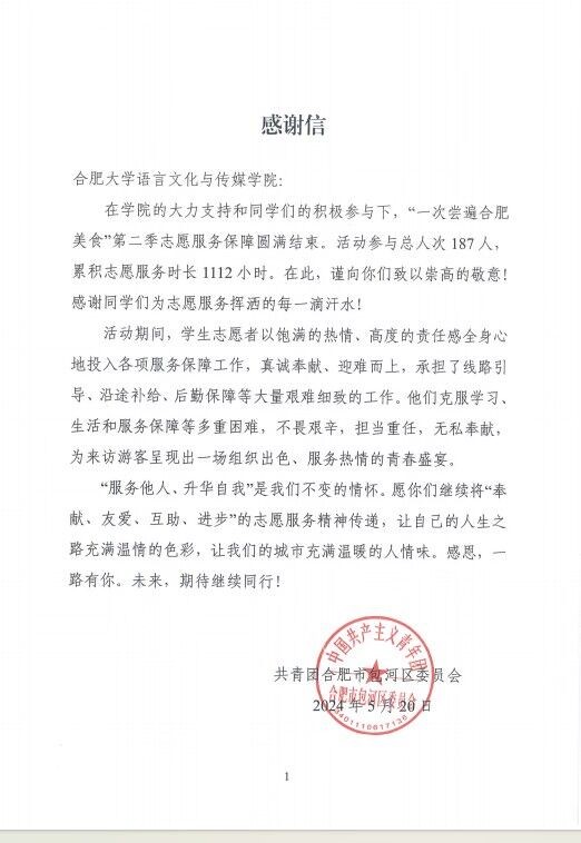 本次活动不仅让我院同学们感受到了贡献青春力量的重要性,也使同学们真正地学习到了社会经验,为同学们以后步入社会打下了坚实的基础。包河区团区委对于此次活动的成功举办也向我院表示感谢,感谢志愿者们的辛勤劳动与付出。“服务他人,升华自我”是同学们不变的情怀,愿同学们继续将“奉献、友爱、互助、进步”的志愿服务精神传递,让自己的人生之路充满温情的色彩,让我们的城市充满温情的人情味。