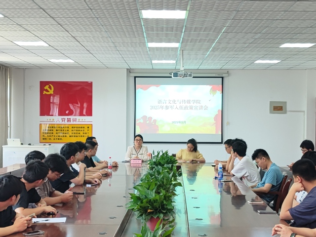 为鼓励广大青年学子响应国家号召,激发参军报国热情,2025年5月21日下午,语言文化与传媒学院在5栋202会议室举办了参军入伍政策宣讲会。会议邀请到学校武装部郑国平老师担任主讲人。学院辅导员魏舒荍、柳守志、陈伟及高年级全体男生参加了会议。