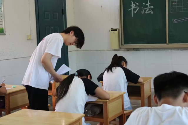 课堂上,教学组成员鲁同德化身传统文化“引路人”,从书法的历史渊源切入,迅速点燃学生们的求知热情。在基础技法教学环节,老师手持粉笔,细致示范“横、竖、撇、捺”的书写要领,强调执笔姿势、运笔力度与呼吸节奏的配合。鲁老师一边讲解一边走到学生身边,手把手纠正姿势,确保每位学生掌握书写规范。