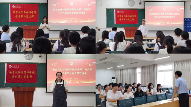 为庆祝中国共产党成立104周年,推动深入贯彻中央八项规定精神学习教育走深走实,近期,语言文化与传媒学院学生第二党支部在5栋309教室召开2025届毕业生党员欢送会。