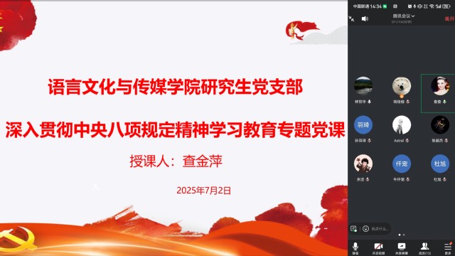 72日下午,党委委员、副院长查金萍以“深入贯彻中央八项规定精神,以优良作风推动研究生全面发展”为题通过线上的方式给研究生党支部全体党员上了一堂专题党课。她强调学术风骨是研究生最大的底气,清正作风是最好的人生名片!要求大家从自身做起、从小事严起,让中央八项规定精神在实验室与教室里扎根、在学术圈中闪光,共同营造风清气正的育人环境!