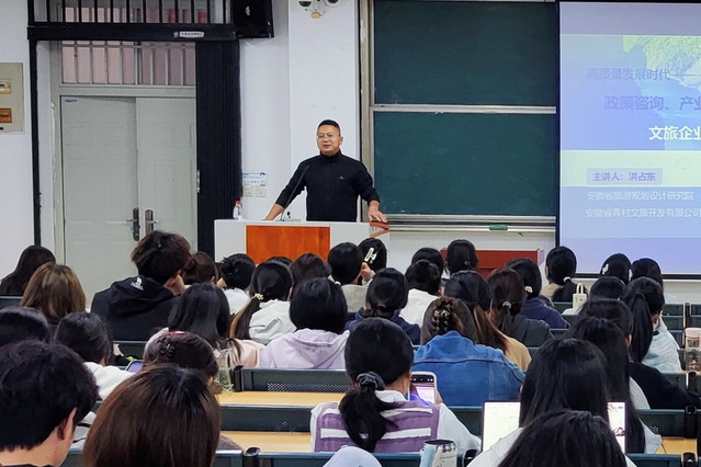 为进一步引导学生明确学习目标、把握行业趋势与岗位能力要求,10月13日,文化与旅游学院邀请安徽省旅游规划设计研究院副院长(主持工作)、安徽省青村文旅开发有限公司总经理洪占东走进《专业导论》课堂,为25级与22级旅游管理专业学生作题为“高质量发展时代的文旅企业发展路径”的讲座。